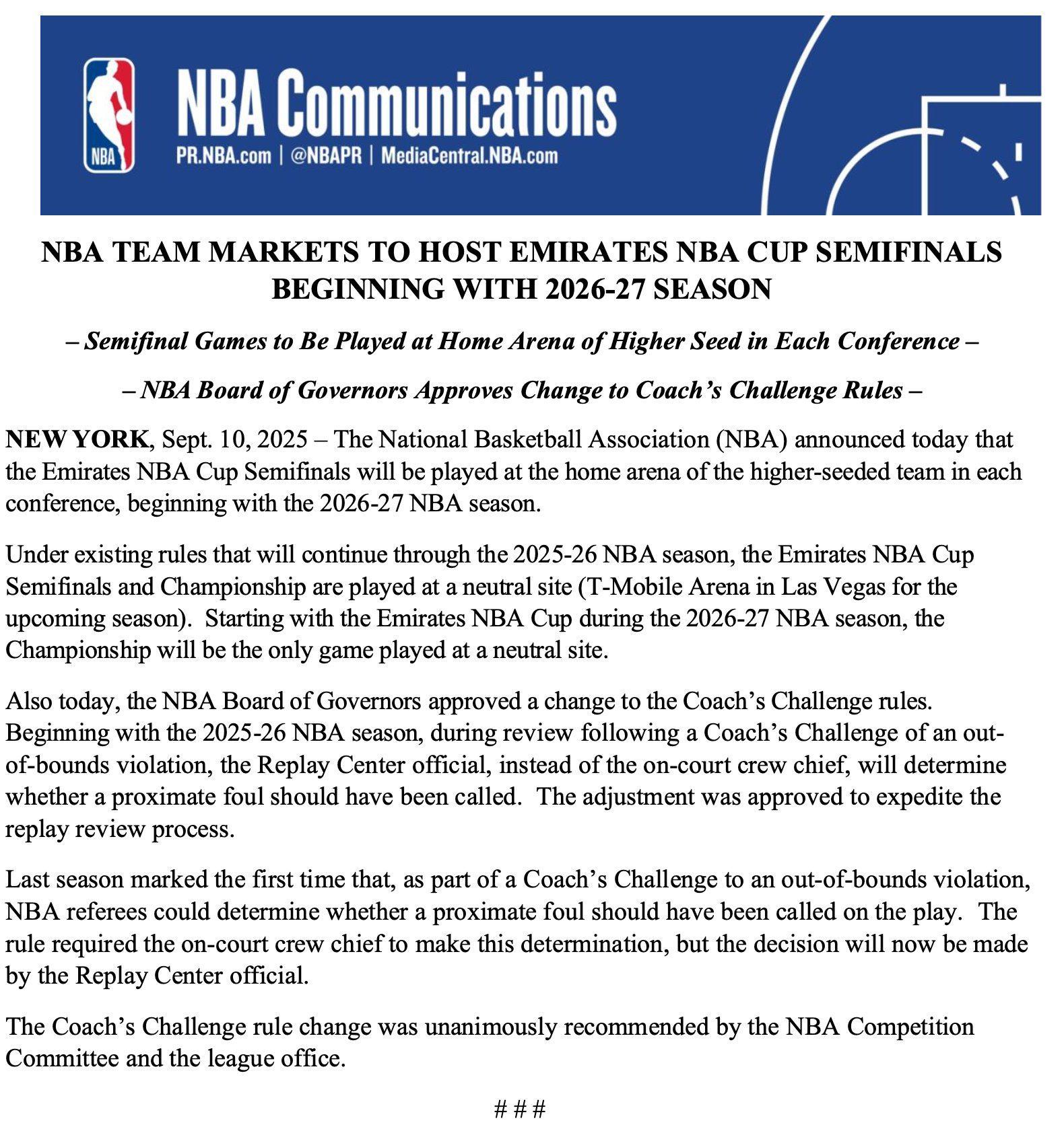 首先是从26-27赛季开始,NBA季中锦标赛半决赛将在各分区排名更高的球队主场举行,但决赛依旧沿用现有规则在中立场地进行(本赛季将在拉斯维加斯举行)。