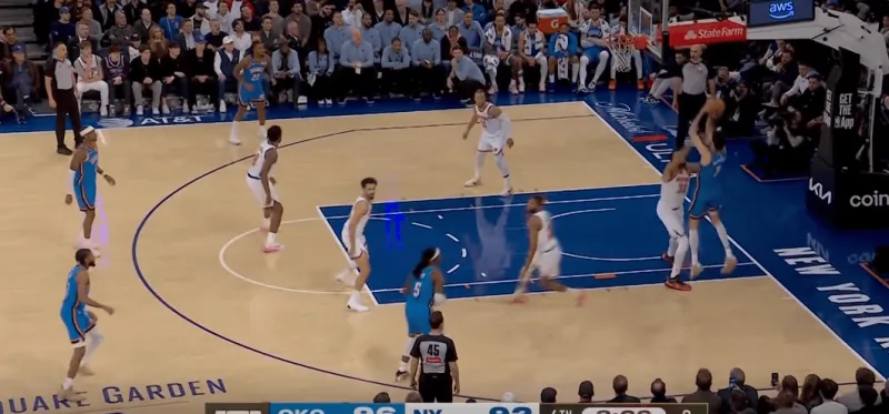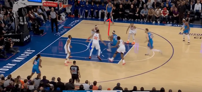 于是切特迅速切入,并利用尼克斯的多人补防SGA,来到禁区完成二次进攻: