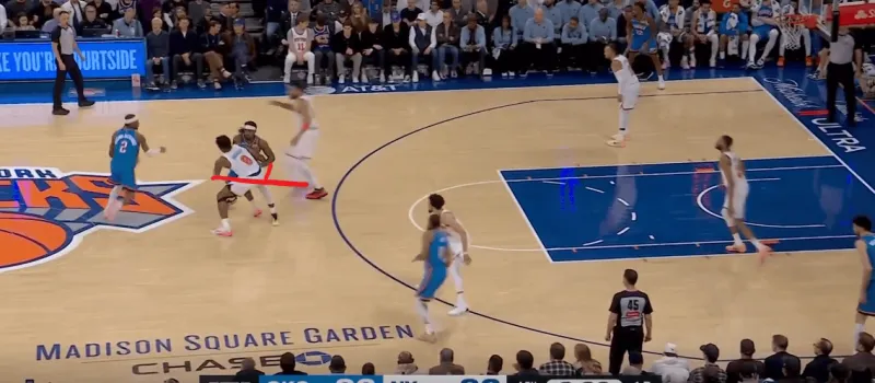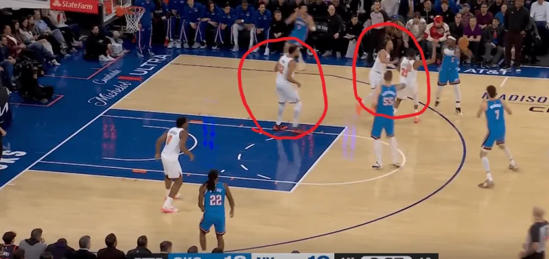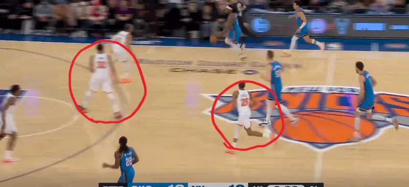 除了切特简单原地接球空位的出手,行进间雷霆也在考验尼克斯保护唐斯下的换防和轮转,在这次转换中布里奇斯对位切特,唐斯迅速回收,