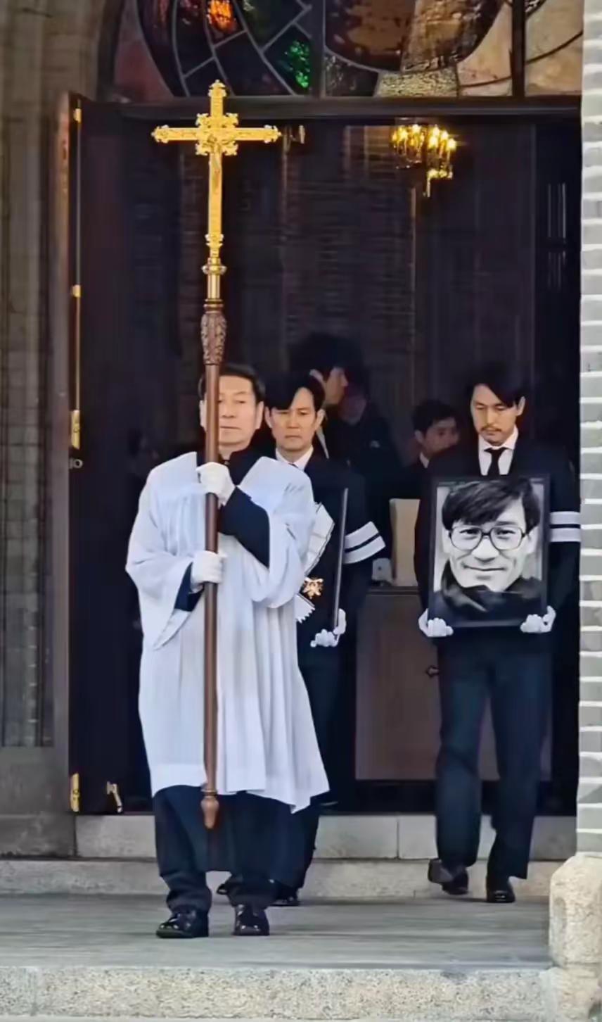 葬礼现场,李政宰、郑雨盛这两位顶尖影帝行跪拜礼,然后手捧安圣基的遗像,神情肃穆地守在灵堂前。