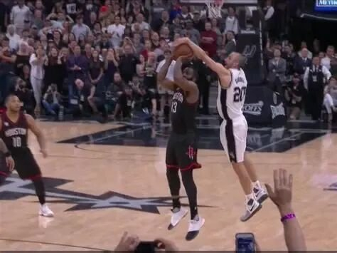 天王山之战的第五场,哈登全场轰下33分10篮板10助攻,且比赛打到后半段,莱纳德踝伤。双方打到101平。但这时,马刺39岁零286天的老将吉诺比利,打出了生涯最后的辉煌表现。他先右翼突破,到篮筐左,起跳,空中转身抛射,得到个人第12分,将比赛拖入加时。加时赛,吉诺比利先助攻丹尼·格林三分球,让马刺106比104领先。之后,吉诺比利持球,耐心地等阿尔德里奇掩护内切;等格林在弱侧走位,吉诺比利一个炮弹横传,助攻格林突破打三分。最后时刻,马刺110比107领先:哈登在三分线外起跳预备出手时,又是吉诺比利,用他老奸巨猾的敏锐意识,横空飞出,将球硬生生地盖掉了。这夺命一盖,让马刺惊险取下第五场,3比2领先。